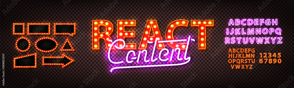 Vector marquee neon sign of React Content text with alphabet font and marquee frames isolated on the transparent background. Easy to use and change color. #1808823039