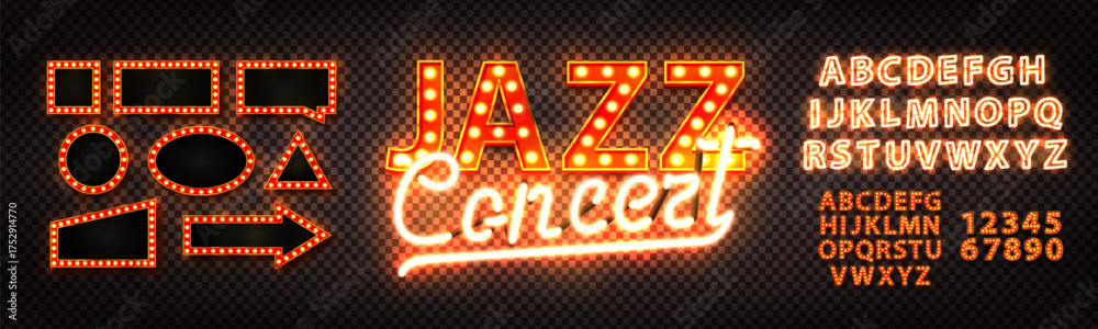 Vector neon sign of Jazz Concert with marquee frames and alphabet set isolated on transparent background. #1752914770