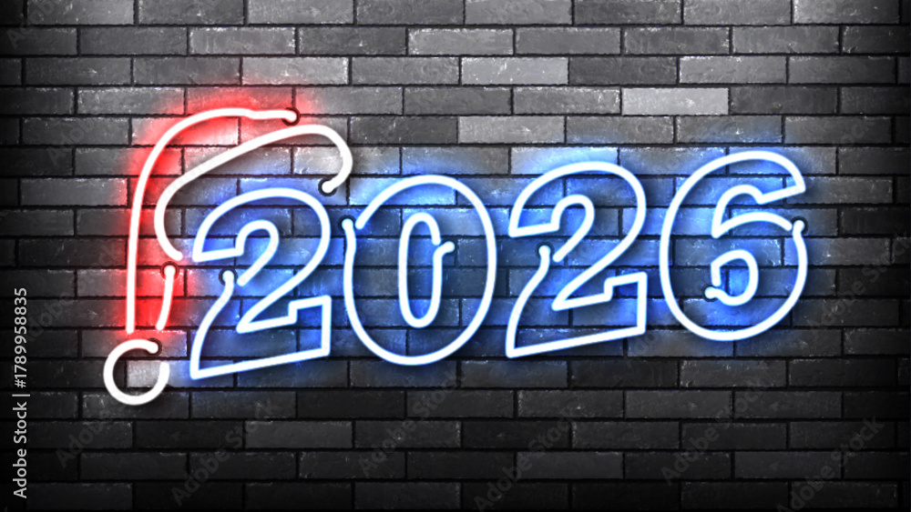 Vector neon sign of 2026 with a Santa Hat isolated on wall background. Concept of Happy 2026 New Year and Merry Christmas. #1789958835