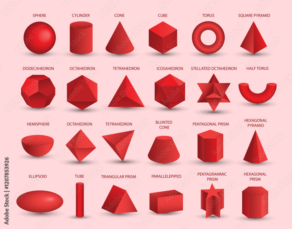 Vector realistic 3D red geometric shapes isolated on background. Maths geometrical figure form, realistic shapes model. Platon solid. Geometric shapes icons for education, business, design. #1207853926