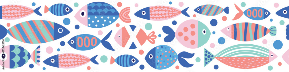 Vector seamless horizontal border with cute fish. Kids illustration. Sardines. #1935415816