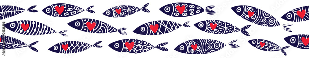 Vector seamless horizontal border with sardines with hearts. Cute illustration. #1904528992