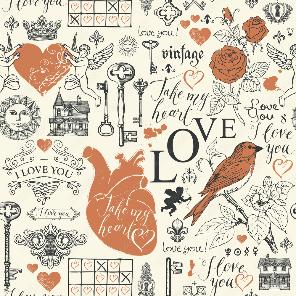 Vector seamless pattern on the theme of love and Valentine day in retro style. Abstract background with hearts, roses, keys, keyholes, cupids and handwritten inscriptions on light backdrop. #298036878