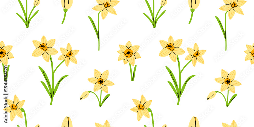 Vector seamless pattern with yellow daffodil flowers on white background. Bright spring narcissus floral print for wallpaper, wrapping paper, textile, fabric, bedding, gift packaging and easter decor. #1944785170