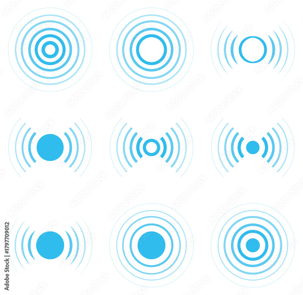 • #1797709012 Vector set of blue radar, sonar, radio waves and signal icons. Radar signal wave icons vector set in various circular and radiating style. Internet connection and radiation icons.