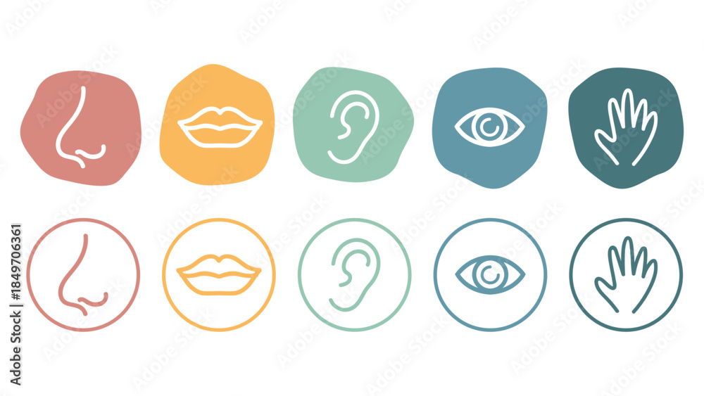 Vector set of five senses icons showing sight, hearing, smell, taste and touch. Two pictogram styles in a modern minimal design for education and sensory concepts #1849706361