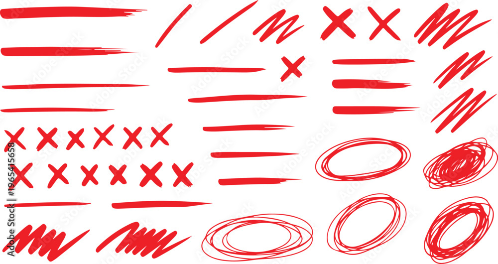 Vector set of grungy graphic elements. Street art texture hand drawn pencil underlines and strikethrough, scribble emphasis lines, crazy hatches, ovals and crosses. #1965415658