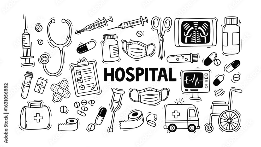 Vector set of hand-drawn hospital equipment and medical symbols in a black and white doodle illustration. #1631056882