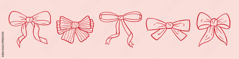 Vector set of whimsical coquette hand drawn ribbon bows in pretty outline on pink background. Charming cute bow collection with different shapes for branding, packaging, social media design. #1918227639