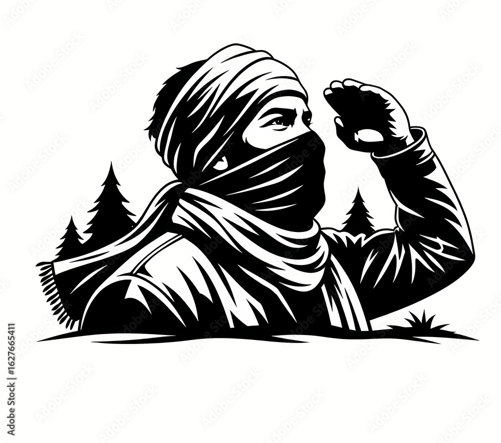 vector style black white stencil drawing of a silhouette of a man wearing a scarf over his face, protest, protester, protestor, anarchy, rebel, fight, fighter, justice, warrior, strength, activist #1627665411