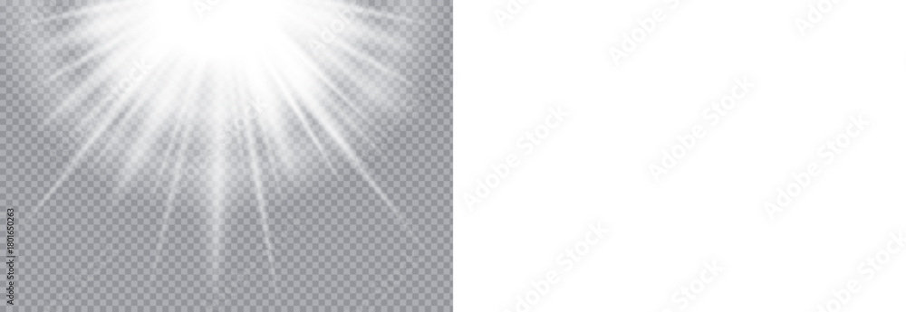 Vector transparent light burst from above with radiant beams and soft glow. Ideal for photo overlays, web graphics, and poster designs. Sunlight rays from top. Bright glow overlay. White light burst. #1801650263