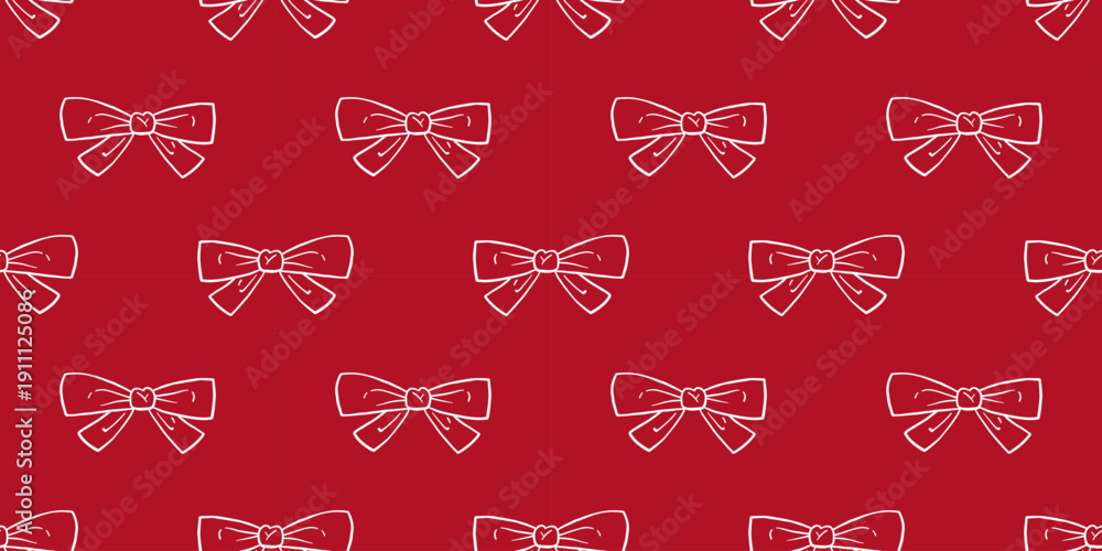 Vector whimsical seamless pattern with hand drawn ribbon bows on red background. Cute charming coquette feminine bow doodle print for wrapping paper, holiday packaging, textile, festive wallpaper. #1911125086