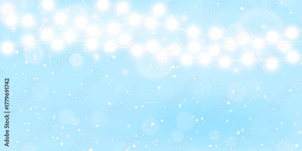 Vector white transparent snowfall Christmas lights on blue background. Winter design Xmas glowing garlands. New year light effect. Christmas decoration, LED lamp #1779691742
