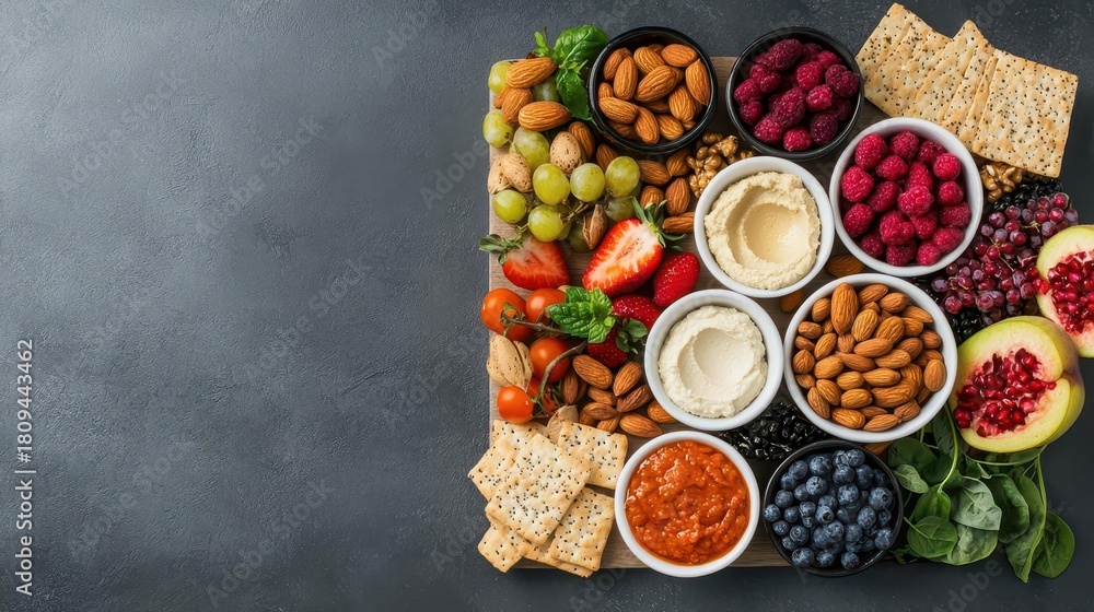 Vegan charcuterie board with nuts, fruits, crackers and hummus, plantbased eating, partyfriendly snack layout #1809443462