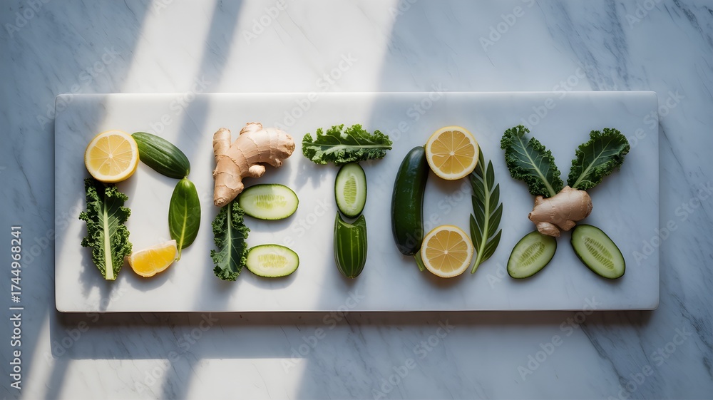 • #1744968241 Vegetables and fruits form the word 'detox', symbolizing health and cleansing.