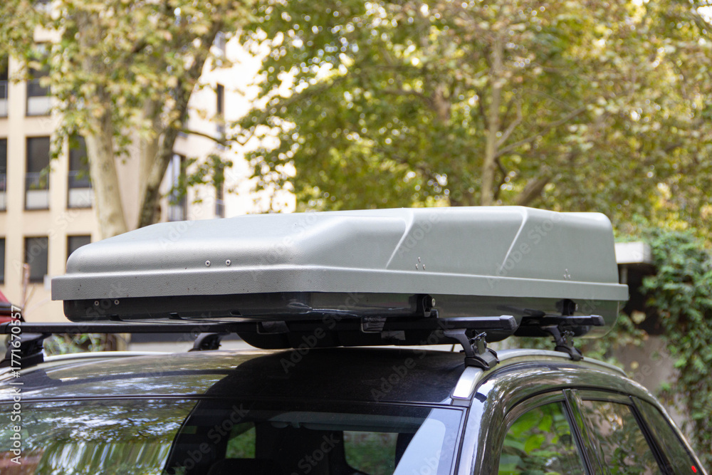 Vehicle roof box mounted on a car, designed for storage and travel, showcasing a sleek gray design against a backdrop of urban greenery and architecture #1771670557