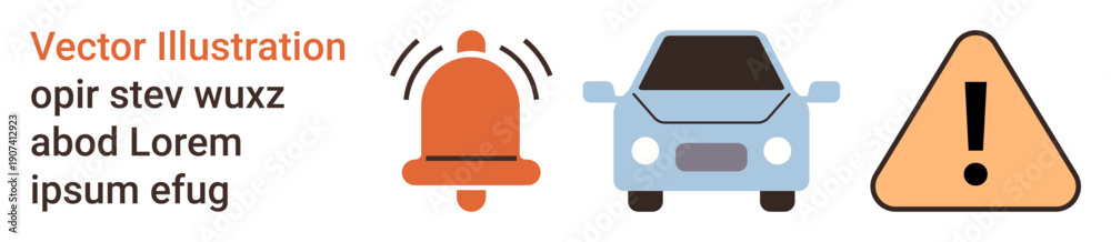 Vehicle safety, warning systems, road caution, driving alerts, automotive icons, safety communication. Image of a car icon adjacent to a bell and warning sign. Vehicle safety and warning systems #1907412923