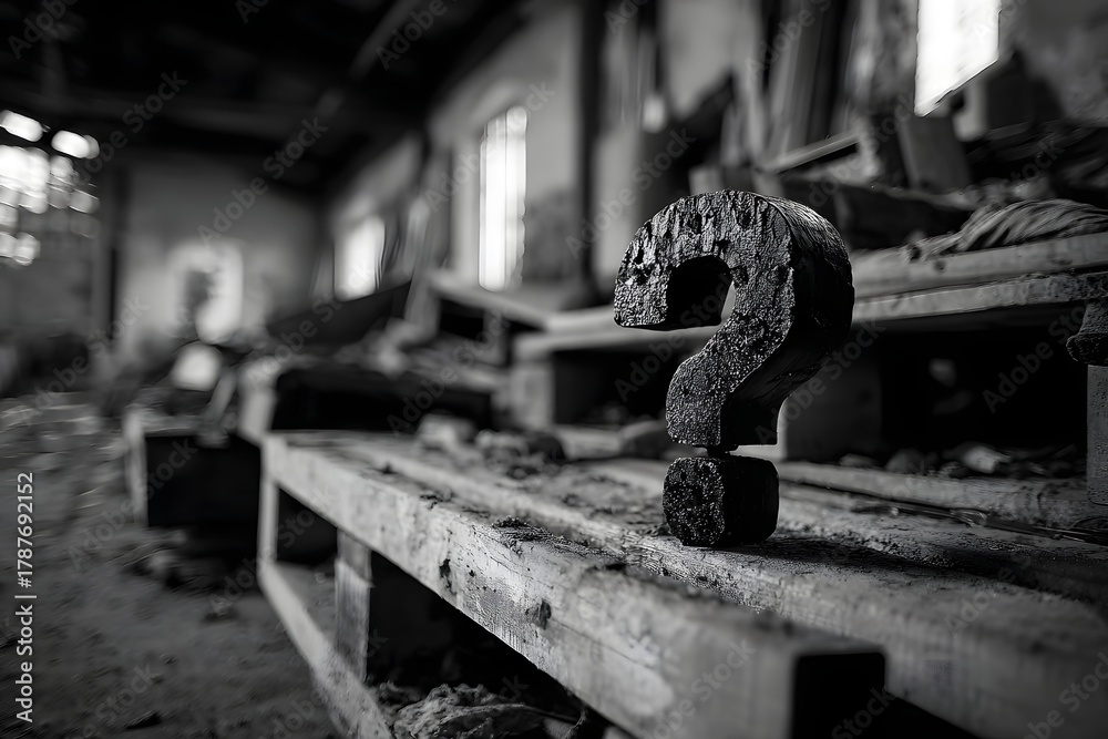 Verrostetes Fragezeichen auf Werkbank – Symbol für Vergangenheit und Verfall #1787692152