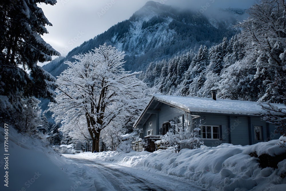 Verschneites Holzhaus im Bergtal umgeben von Winterwald #1771416077