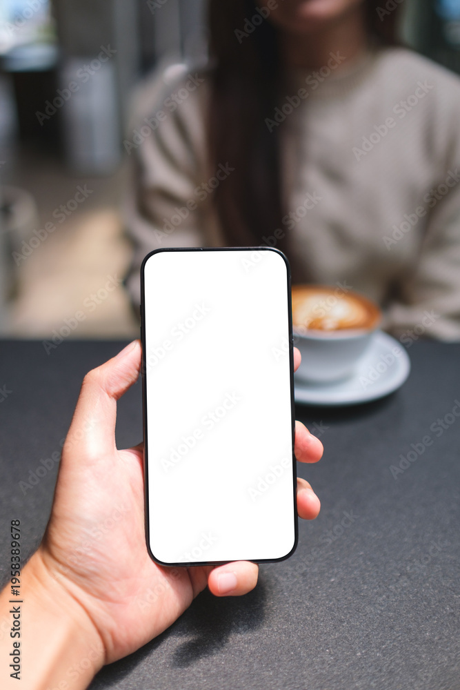Vertical mockup image of a man holding mobile phone with blank screen with a blurred woman drinking coffee in background #1958389678