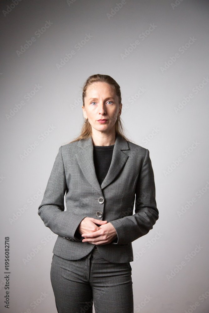 Vertical photo. A woman in a business suit with her arms folded. #1956082718