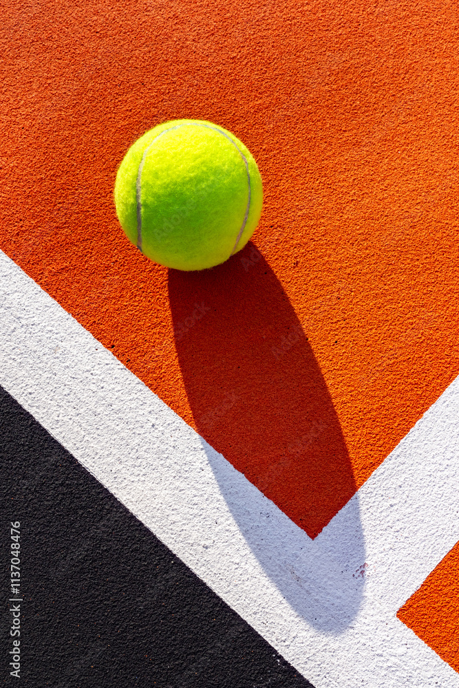 Vertical photo of a yellow tennis ball on orange and black tennis court - pickleball court with white baseline and black out of bounds #1137048476