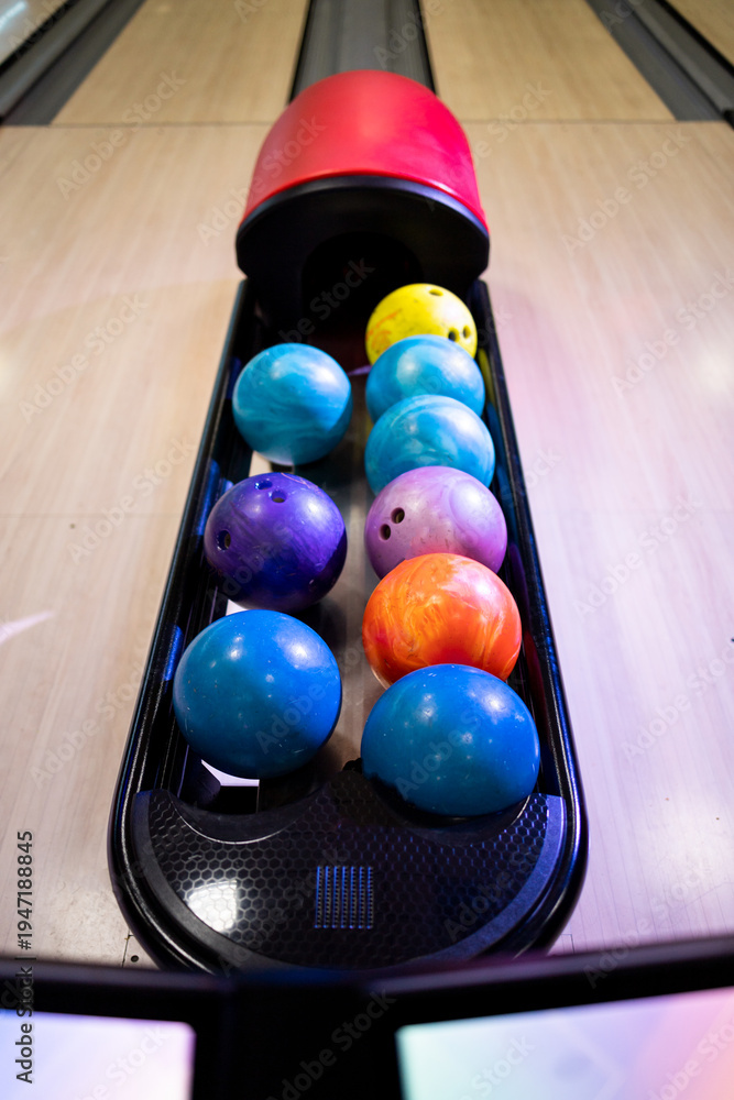 Vertical photograph of balls being received in a bowling alley. Bowling alley concept. #1947188845