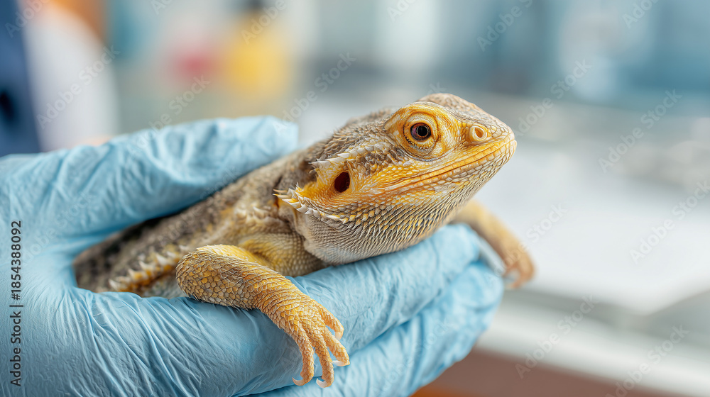 Veterinarian gently holding a bearded dragon lizard during a health check in a veterinary clinic, concept of exotic pet care, animal health, and professional veterinary service. #1854388092