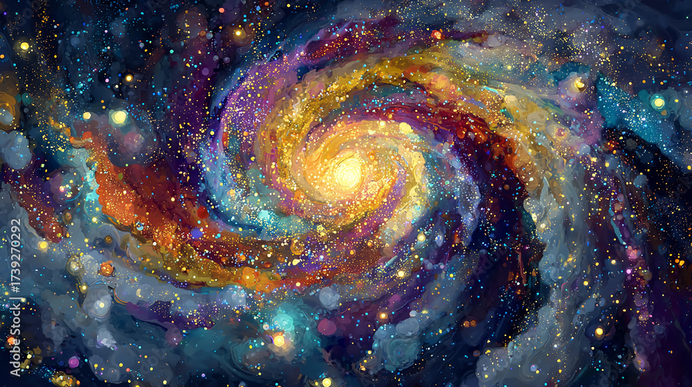 Vibrant abstract spiral galaxy background with colorful swirling patterns and glowing bright particles, high detail, cosmic space theme #1739270292