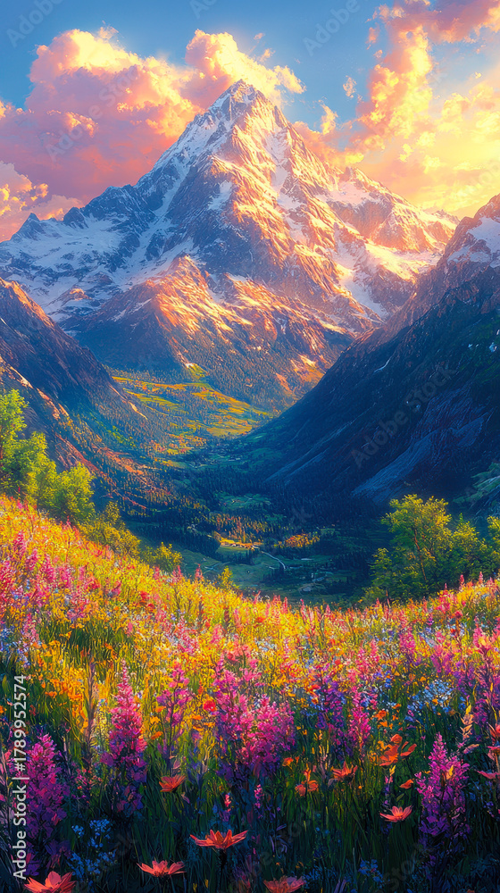 Vibrant alpine meadow bursting with colorful wildflowers under a dramatic sunset sky, with a majestic snow-capped mountain peak towering in the background, evoking natural beauty #1789952574