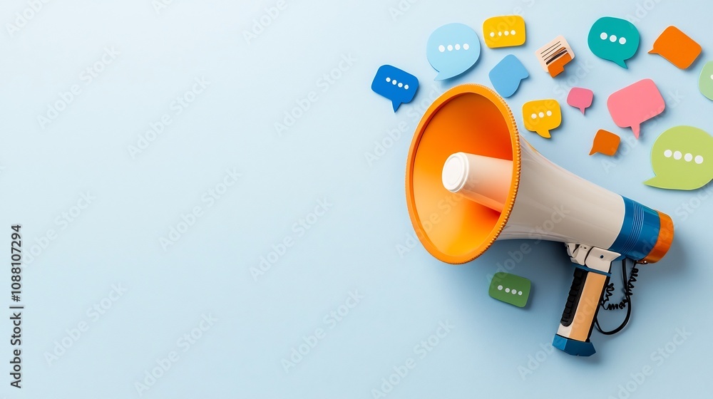 • #1088107294 Vibrant and bold megaphone icon with colorful speech bubbles against a clean background representing the concepts of social media digital marketing advertising and effective communication