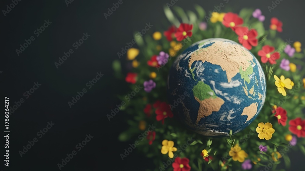 Vibrant and colorful image of the Earth covered in a lush array of wildflowers symbolizing the importance of biodiversity and the natural balance of our planet #1786064217