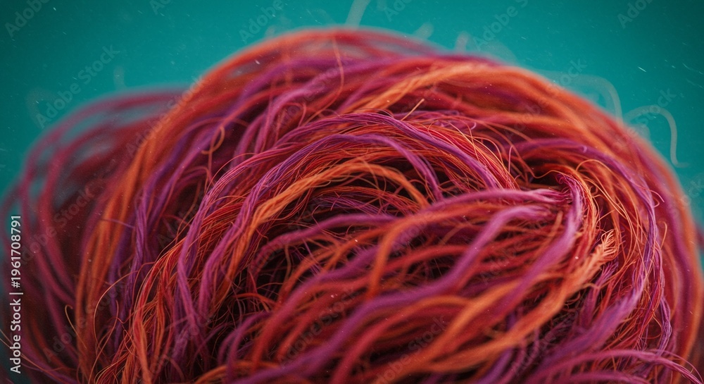 Vibrant ball of pink and orange yarn on teal background colorful threads tangled together in a creative craft supply #1961708791