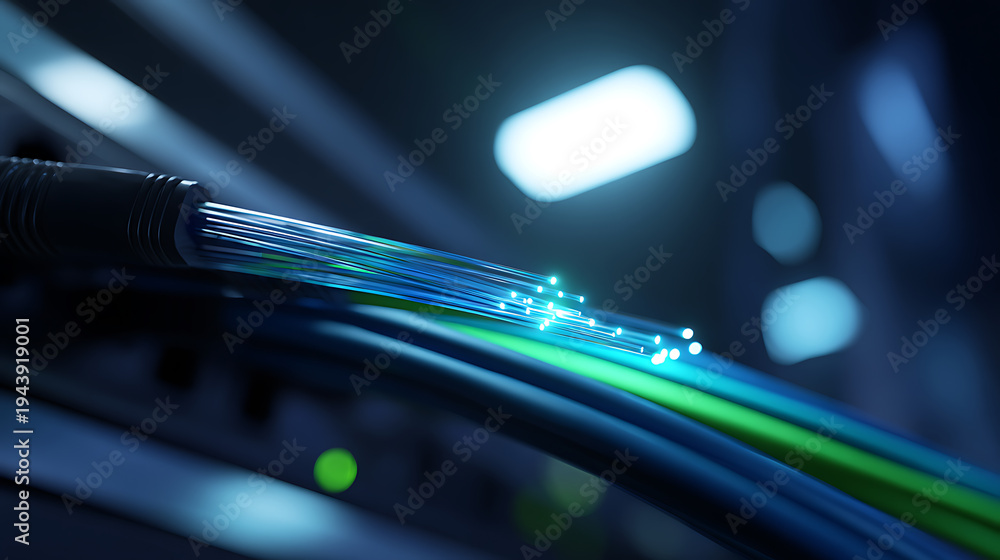 Vibrant blue and green fiber optic cables illuminate a server rack, showcasing high-speed data transmission and network technology connectivity #1943919001