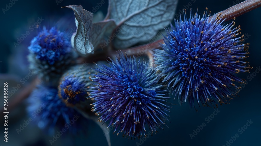 Vibrant blue burdock flower in full bloom showcasing delicate petals and natural texture, captured in close-up botanical photography highlighting the beauty of wild plants and herbal nature in a seren #1756835528