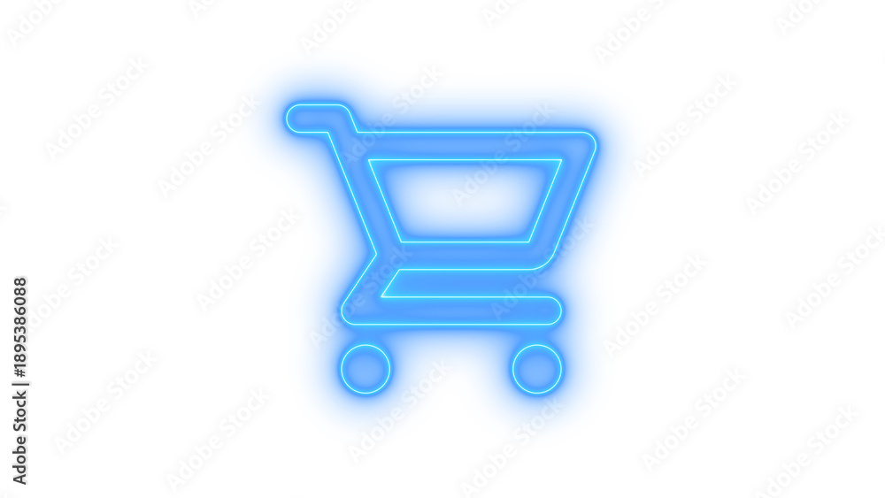 Vibrant blue neon shopping cart icon glowing with modern electric light, symbolizing online retail, digital commerce, and consumer purchases, isolated on transparent background. #1895386088