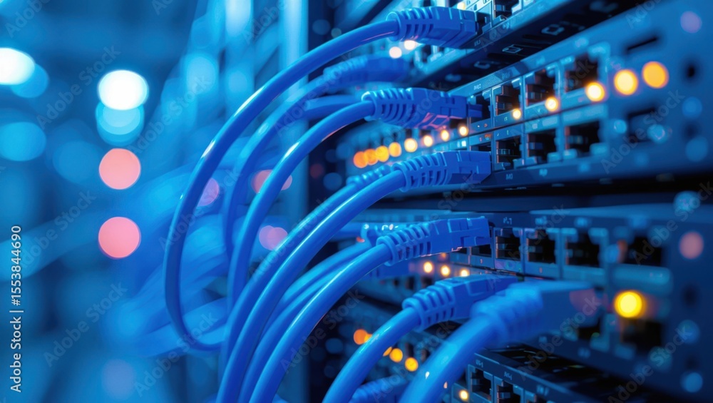 Vibrant blue network cables connect to server rack ports with blurry bokeh lights in the background #1553844690