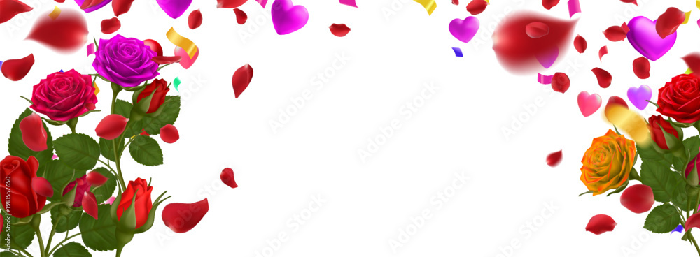 Vibrant bouquet of red, pink, and orange roses with falling petals and purple hearts luxury banner for perfume and fabric softener advertisement promotion Valentines Day wedding gift floral frame #1918557650