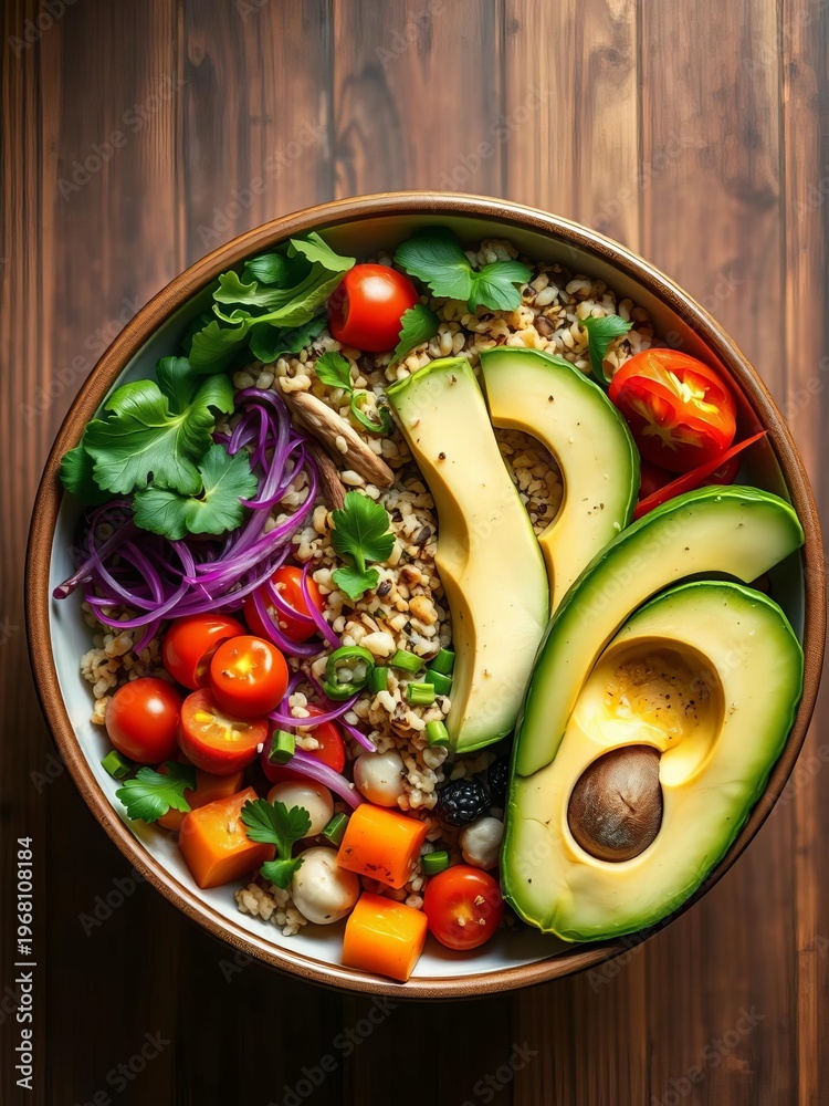 Vibrant bowl of fresh vegetables, quinoa, and avocado, bursting with color and nutrition, fresh, vegetarian #1968108184