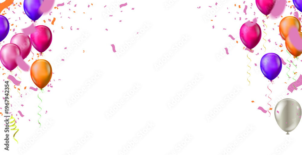 Vibrant celebration background featuring groups of glossy balloons in various colors including purple, magenta, orange, and silver, floating on both sides #1967942354