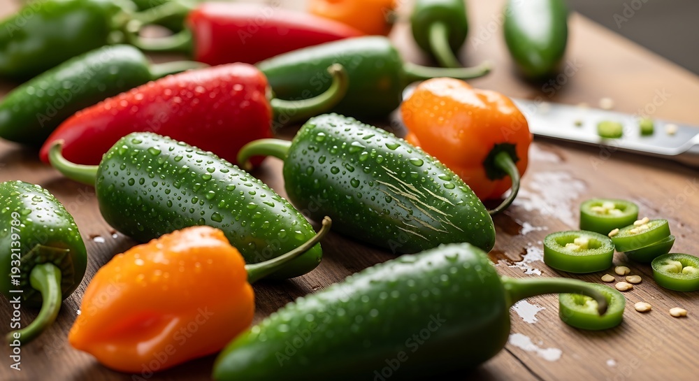 Vibrant Chili Symphony: An artistic arrangement of fresh, colorful chilies and sliced peppers, ready for culinary adventure. #1932139789