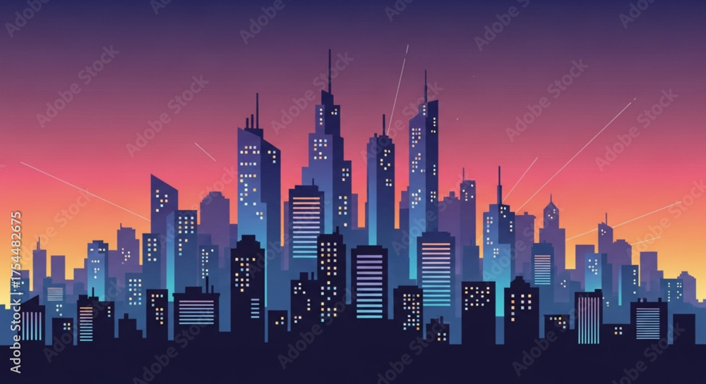 Vibrant cityscape silhouette at sunset, showcasing a modern urban skyline with illuminated buildings and a colorful sky, creating a dynamic and stylized illustration #1754482675