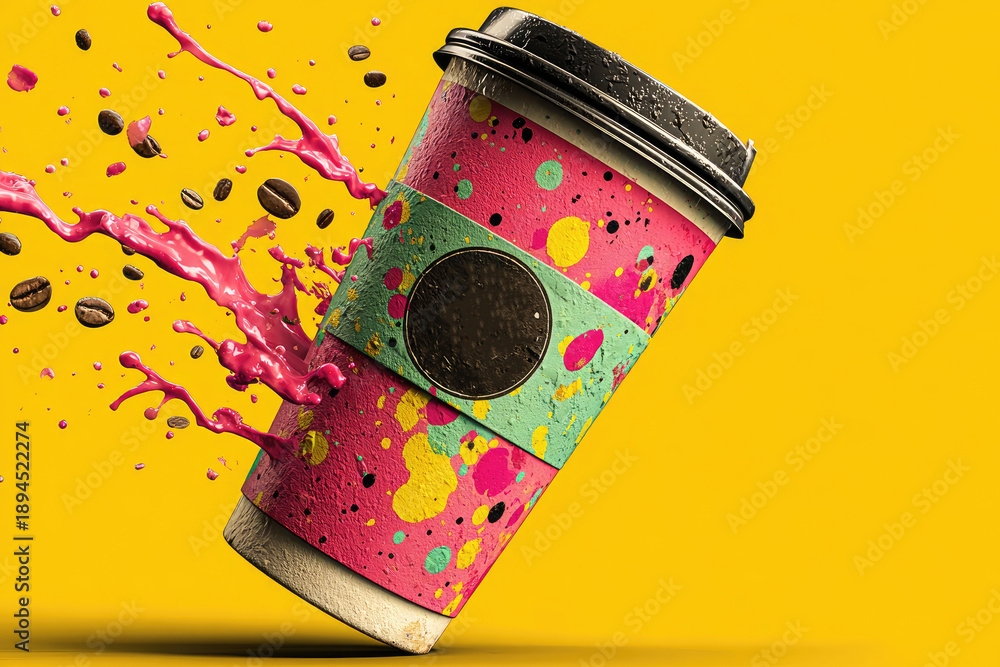 Vibrant Coffee Splash with Pink Paint and Coffee Beans Against Bright Yellow Background #1894522274