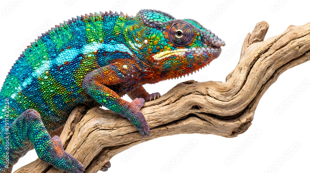 Vibrant Colorful Chameleon Perched on Twisted Driftwood Branch with Intricate Scales Shining in Shades of Green Blue Orange and Yellow #1971425258