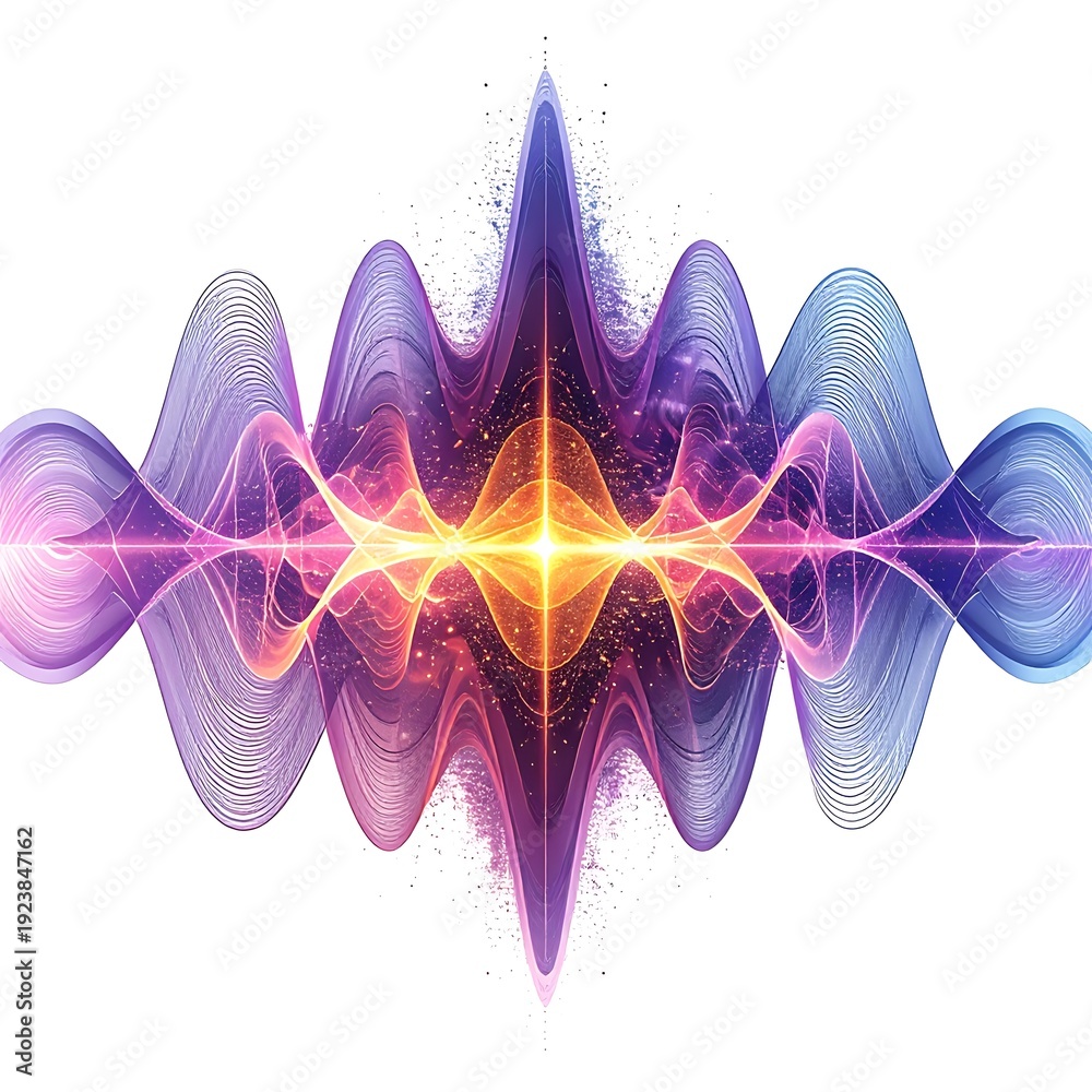 Vibrant, colorful sound wave design with ethereal glow, purple & blue hues. Energy bursts from the core #1923847162