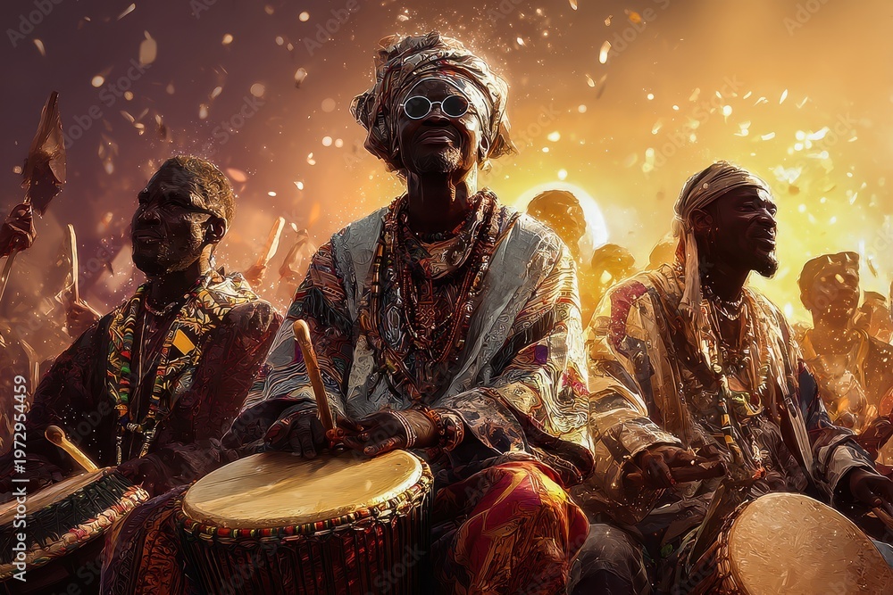 Vibrant cultural celebration with musicians playing traditional drums, capturing the essence of joyous community spirit. #1972954459