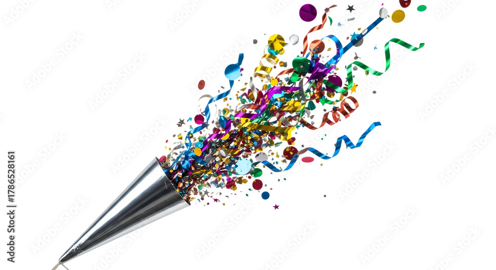 Vibrant explosion of colorful confetti streamers and metallic shapes bursting joyfully from a party popper for celebrations #1786528161
