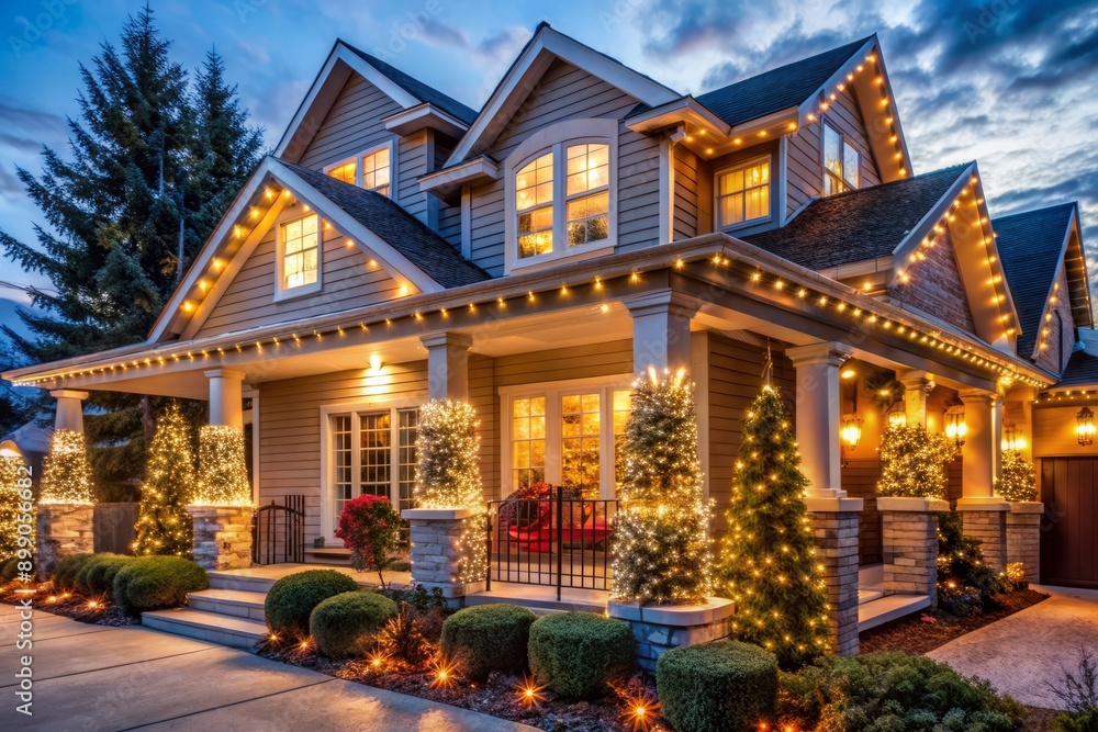 Vibrant exterior of a suburban house adorned with twinkling string lights wrapped around pillars and roof, creating a warm and inviting festive atmosphere. #899056682