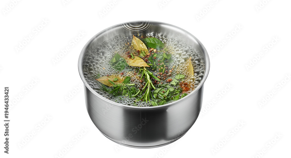 Vibrant fresh herbs and aromatic spices gently boiling in a gleaming pot, releasing fragrant steam for culinary delight #1946433421