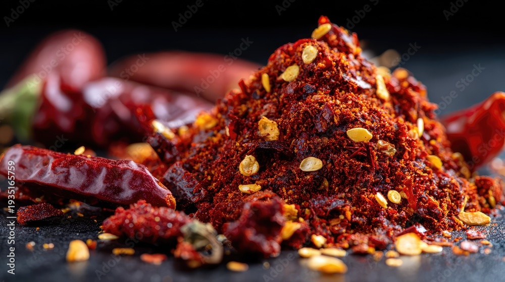 Vibrant Ground Red Chili Powder with Whole Dried Peppers on Dark Background Creating an Inviting and Spicy Culinary Atmosphere for Food Photography and Cooking Inspiration #1935165759
